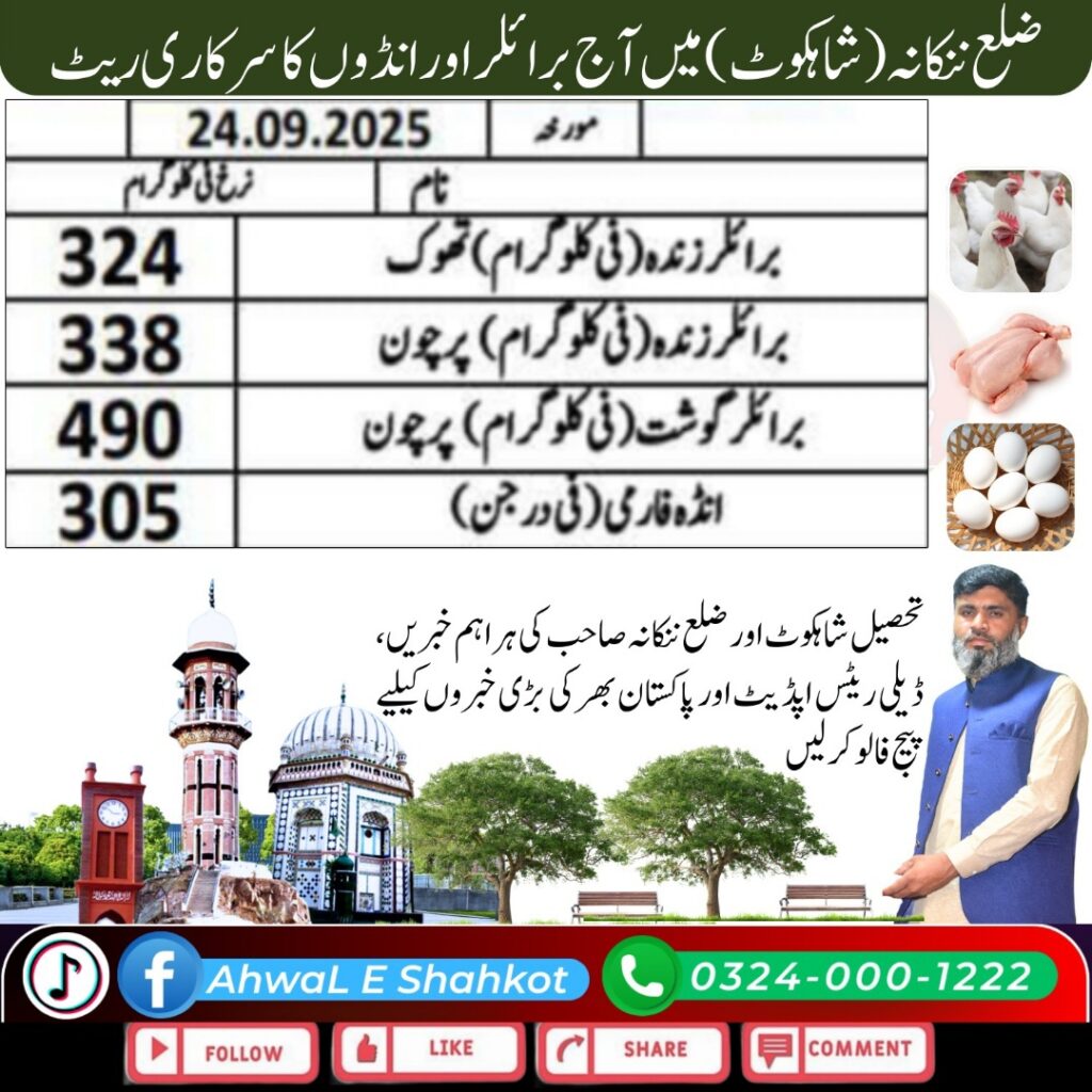 Rate update Rates Shahkot news آج کے برائلر اور فارمی انڈوں کے ریٹس Ashiq Bhatti Wed 2 Rabi Al Thani 1447 // 24-9-2025 About the Author Ashiq Bhatti Administrator Visit Website View All Posts Tags: #rate #news #newsfeed #newsbreakapp #newstoday #newsong #NewsUpdate #NewsFlash #Headlines #HeadlineNews #headlights #HeadlinesToday #headlining #breakfast #breakup Post navigation Previous: ریٹ لسٹNext: ننکانہ پولیس کی بڑی کارروائی بھاری مقدار میں اسلحہ برآمد کر لیا Leave a Reply Cancel replyYour email address will not be published. Required fields are marked *Comment * Name * Email * Website Save my name, email, and website in this browser for the next time I comment. Related Stories inter national Nankana Sahib national news Shahkot news ڈپٹی کمشنر ننکانہ صاحب کا THQ ہسپتال شاہکوٹ کا اچانک دورہ Ashiq Bhatti Tue 12 Jumada Al Akhira 1447 // 2-12-2025 Crime Nankana Sahib Shahkot news ننکانہ پولیس نے شہریوں کی طلبی کی فہرستیں عوامی سطح پر جاری کر دیں Ashiq Bhatti Wed 16 Rabi Al Thani 1447 // 8-10-2025 Rate update Rates Shahkot news ضلع ننکانہ صاحب میں پھلوں کے ریٹ جاری Ashiq Bhatti Tue 15 Rabi Al Thani 1447 // 7-10-2025